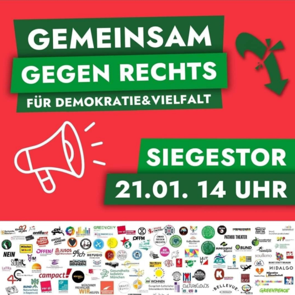 Die Demonstration „Gemeinsam gegen Rechts – für Demokratie und Vielfalt“ findet am Sonntag, den 21. Januar 2024 ab 14:00 Uhr am Siegestor in München statt. Initiatoren sind die Initiative München ist bunt und ein breites Bündnis von Organisationen aus Zivilgesellschaft, Gewerkschaften, Parteien und Kirche.