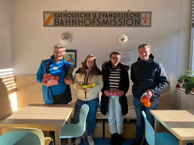 Mit dem Ziel, nicht nur den Menschen im Ausland zu helfen, sondern auch im eigenen Land, reisten Hanna Köpferl, Julia Kutschka und Tizian Schmidt mit dem Zug von Tittmoning zur Bahnhofsmission am Hauptbahnhof in München an. Im Gepäck einen großen Einkaufswagen voller Lebensmittel wie Käse, Wurst, Marmelade und Obst, welche die drei Vertreter der Kolpingjugend Tittmoning am Vortag gemeinsam eingekauft hatten. Als Sachspenden werden diese Lebensmittel zur Verpflegung der Hilfesuchenden direkt vor Ort in der von katholischer und evangelischer Trägerschaft kooperativ getragenen Bahnhofsmission München verwendet.