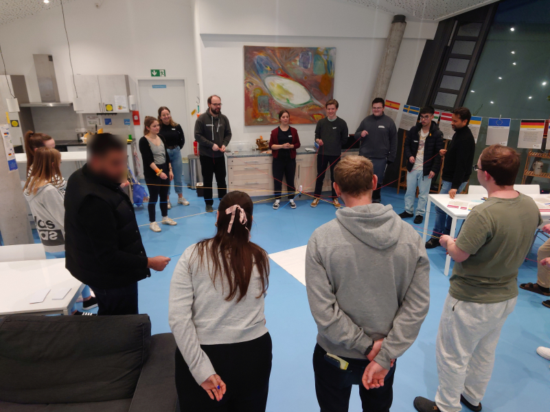 Um auch die Schwierigkeit von Politik in so großem Maßstab zu verdeutlichen, bekamen die Teilnehmenden anfangs die Aufgabe, gemeinsam ein Haus zu zeichenen. Dazu erhielt jede Person ein Schnurende. In der Mitte der Schnüre hing an allen Fäden ein Stift, der dabei zum Schreiben diente (siehe Foto).