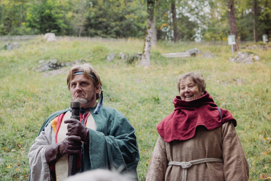 Die Bannerträger führen den Pilgerzug an, der an vier Stationen Halt machte. Raphael Hupe schlüpfte in die Rolle des heiligen Korbinian, der auf seinem Weg nach Rom verschiedene Personen traf, die den Teilnehmenden Impulse für den Weg mitgaben. „Wo sind meine Ruheorte, welche Ratschläge gebe ich aus meiner Glaubensüberzeugung heraus anderen, vor welchem Unrecht möchte ich Menschen heute warnen?“ waren einige Gedanken, die Mitglieder der Kommission Spiritualität als Denkanstöße und Gesprächsimpulse setzten.