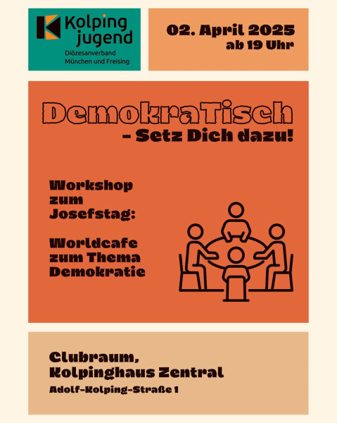Die Diözesanleitung der Kolpingjugend veranstaltet in Zusammenarbeit mit der neu gegründeten Kolpingjugend München Zentral ein Worldcafé zum Thema "Demokratie" im Kolpinghaus München Zentral. Eingeladen sind neben den Bewohnerinnen und Bewohnern der Kolping-Wohnheime alle Jugendlichen und jugen Erwachsenen aus dem gesamten Diözesanverband.