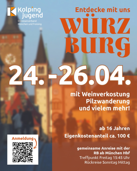 Der Diözesane Arbeitskreis lädt dich zu einem gemeinsamen Wochenende nach Würzburg ein. Dich erwartet ein abwechslungsreiches Programm, das Kultur, Gemeinschaft und echte Würzburger Lebensart verbindet.