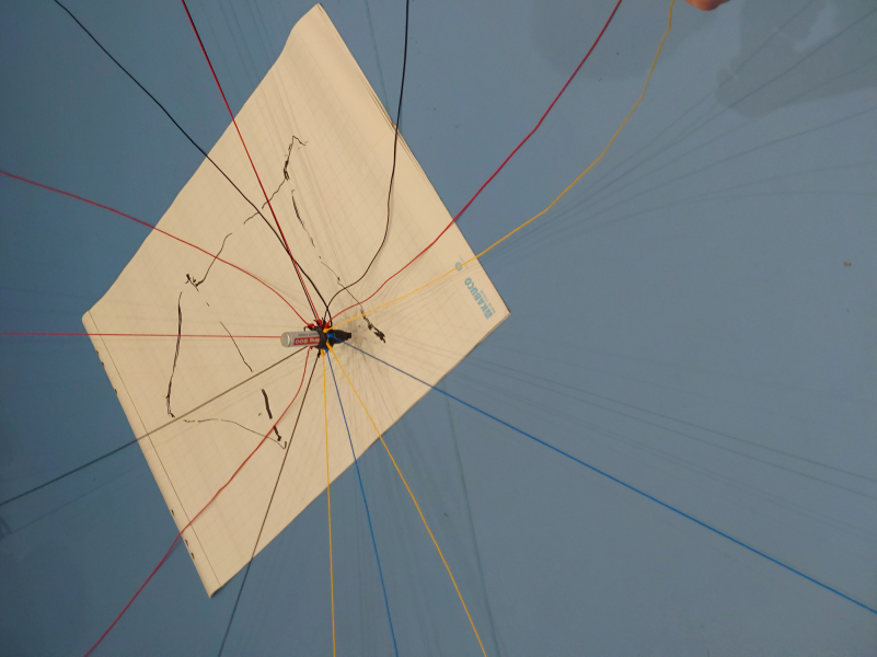 Um auch die Schwierigkeit von Politik in so großem Maßstab zu verdeutlichen, bekamen die Teilnehmenden anfangs die Aufgabe, gemeinsam ein Haus zu zeichenen. Dazu erhielt jede Person ein Schnurende. In der Mitte der Schnüre hing an allen Fäden ein Stift, der dabei zum Schreiben diente (siehe Foto).
