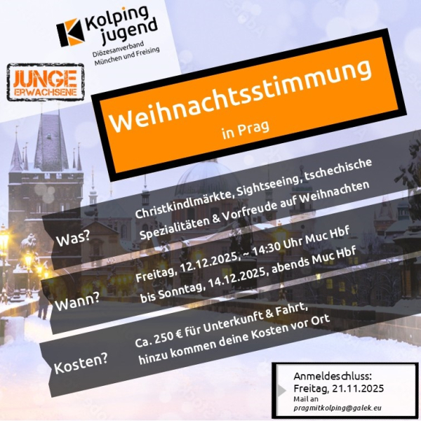Lust auf ein Adventswochenende voller Lichterglanz, Glühwein und Gemeinschaft? Dann komm mit uns vom 12. bis 14. Dezember 2025 nach Prag – gemeinsam mit anderen jungen Erwachsenen entdecken wir die winterliche Schönheit dieser Stadt und stimmen uns auf Weihnachten ein.